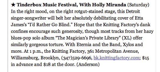 The New York Times encourages you to go see Tinderbox Music Festival, especially to check out headliner Holly Miranda. Check it out: http://www.nytimes.com/2011/09/09/arts/music/pop-and-rock-listings-for-sept-9-15.html?_r=1