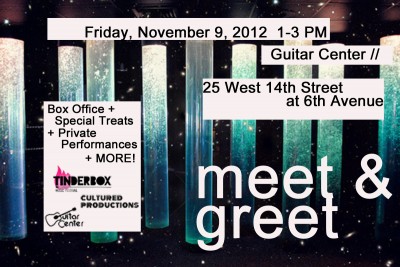 Official MEET & GREET at Guitar Center! Posted on November 8, 2012 by tinderboxmusicfestival MEET & GREET your favorite TINDERBOX artists Friday, November 9 at Guitar Center by Union Square from 1-3PM. No RSVP, just show up! Share this: Click to share on Facebook (Opens in new window) Facebook Click to share on X (Opens in new window) X Like Loading... Related