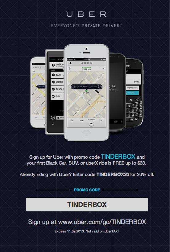 Hey Tinderbox festival-goers! Are you planning on taking a cab to Music Hall next Friday? Well, thanks to our friends at Uber, you won’t have to! This private car service is giving away a special promotional code for all Tinderbox artists and attendees. All new users will get a free car ride of up to $30, when you enter the code TINDERBOX. And all current users will get 20% off their Uber ride with the code TINDERBOX20.